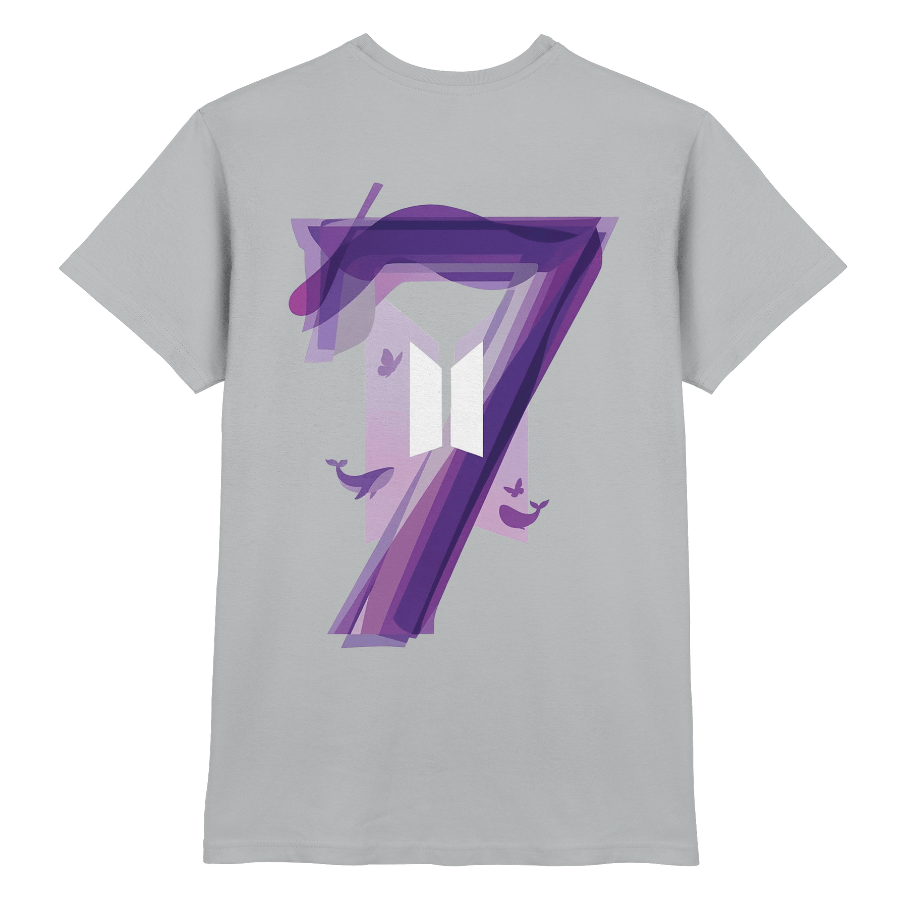 Der großflächige Back-Print kombiniert die ikonische Zahl 7 mit dem BTS-Logo sowie den symbolträchtigen Walen und Schmetterlingen. Ein Design, das Geschichten erzählt und auf jedem Festival oder Fan-Event garantiert die Blicke auf sich zieht.