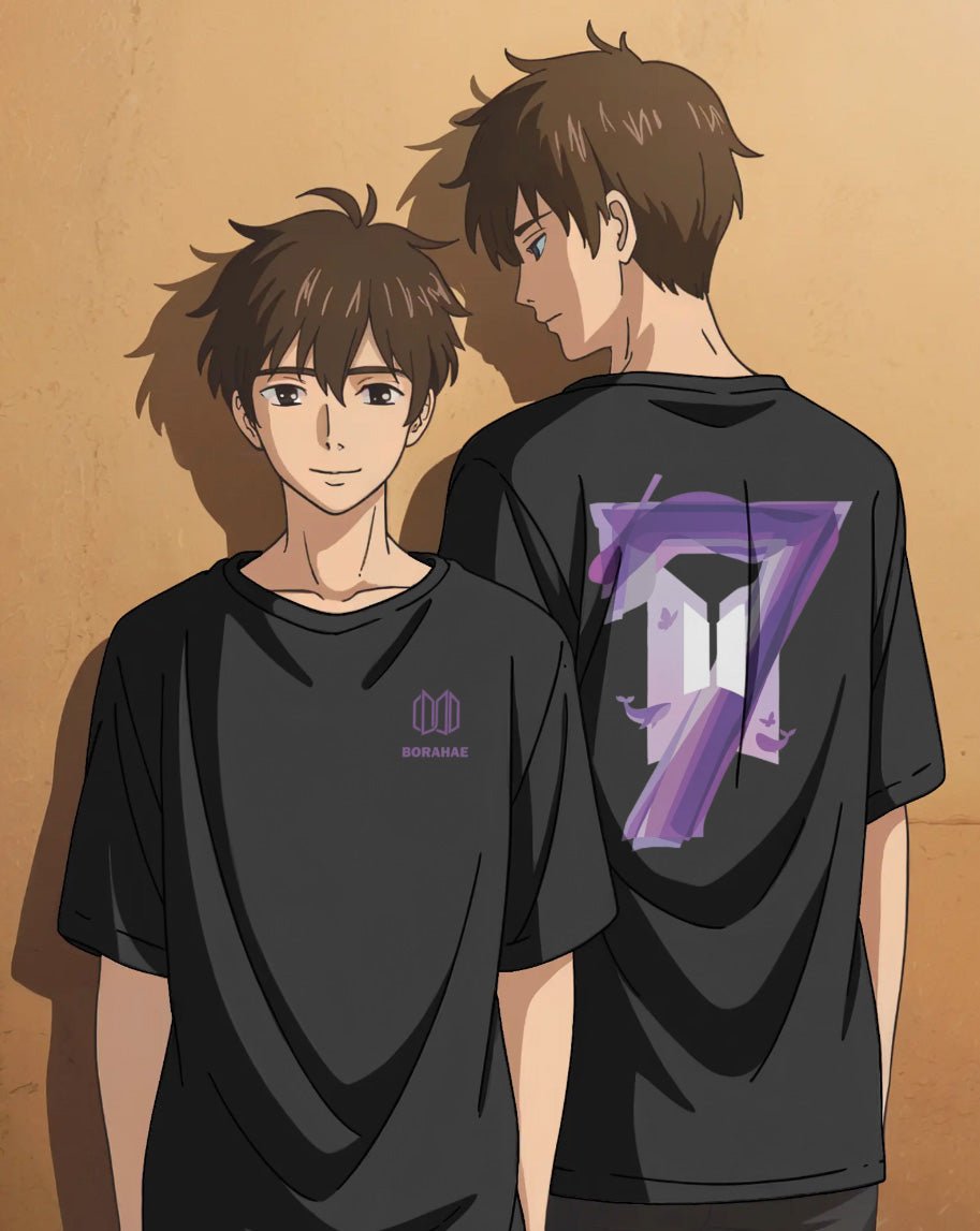 Ein Symbol, das verbindet: Das Borahae "7" Fan-T-Shirt ist eine Hommage an die Reise von BTS und die unzerbrechliche Verbindung zur ARMY. Während die Vorderseite mit einem dezenten, lilafarbenen Logo und dem Schriftzug "Borahae" (I Purple You) überzeugt, offenbart die Rückseite ein wahres Kunstwerk.